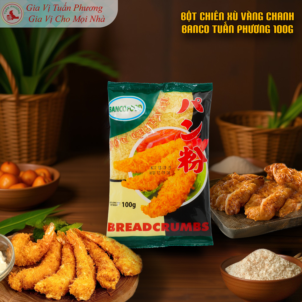 Bột chiên xù Banco Tuấn Phương có hạt xù đều, bám tốt, giúp món chiên lên màu vàng đẹp, giòn xốp và hạn chế rơi vụn trong quá trình chiên.